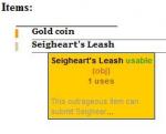 [quote name='Ackshan Bemunah' timestamp='1345201846' post='120322'] Okay, found my source: From announcement 2203: "Each of these items have 200 uses after which the item is returned to the slave, who can do with it as they want." Not sure if that means it recharges, but if so, using the leash effectively gives Seig something to sell. [/quote] yes, if it resets to the owner it will return with 0 uses, so Seigheart will get it back with 200 possible uses again... i wonder why fang purposely posted a screenshot showing 170 uses then spent used all the uses up... its just wrong...