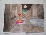 3. Here is a picture of the inside of a cave with a glass and dagger on a table. From the enterance of the cave you can see the moon and tree line. to the right is a small pool of water that reflects the moon.