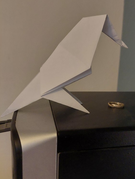 Okay, this isn't my submission, but super happy with how it turned out as a beginner to Origami in general. Her beak is a bit messed up, but she found a shiny ring and so at least has that going for her. Probably going to be a while before anything submission worthy, going to take a while to figure out how to progress from following tutorials to actually designing my own Winderwild! But it's a start.